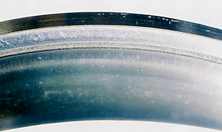 Part : Cage of a deep groove ball bearing Symptom : Scoring on the pressed-steel cage pocketsCause : Entry of debris