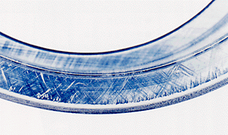 Part : Inner ring of a tapered roller thrust bearingSymptom : Scoring on the face of inner ring ribCause : Worn particles mixed with lubricant, and breakdown of oil film due to excessive load