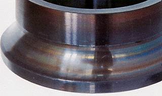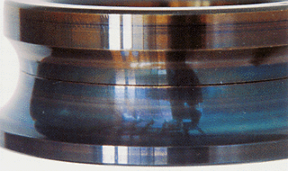 Part: Inner ring of an angular contact ball bearing Symptom: Bluish or purplish Discoloration on raceway surface Cause: Heat generation due to poor lubrication