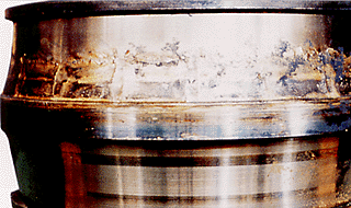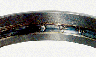 Part : Inner ring of an angular contact ball bearing Symptom : Raceway Discoloration, melting at ball pitch intervals Cause : Excessive preload