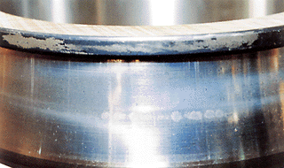 Part : Outer ring of a spherical roller bearing Symptom : Peeling occurs near the shoulder of the raceway over the entire circumference Cause : Poor lubrication