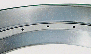 Part : Outer ring of a double-row tapered roller bearing Symptom : Indentations on raceway surface Cause : Debris caught in the surface