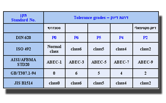 רמת הדיוק של מימדי המיסב ורמת דיוק פעולת המיסב, מצוינות באמצעות התקן הבא: