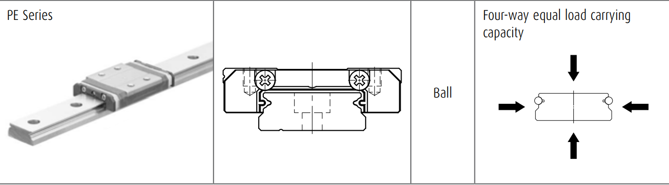 אידיאלי לשימוש כמסילה בודדת – סדרת PE הינה סדרה מיניאטורית עם מסילה לניארית רחבה, המבנה של המסילה מאפשר הובלה ליניארית תוך עמידה מצוינת בעומסים ומומנטים גדולים בכיוון התנועה.